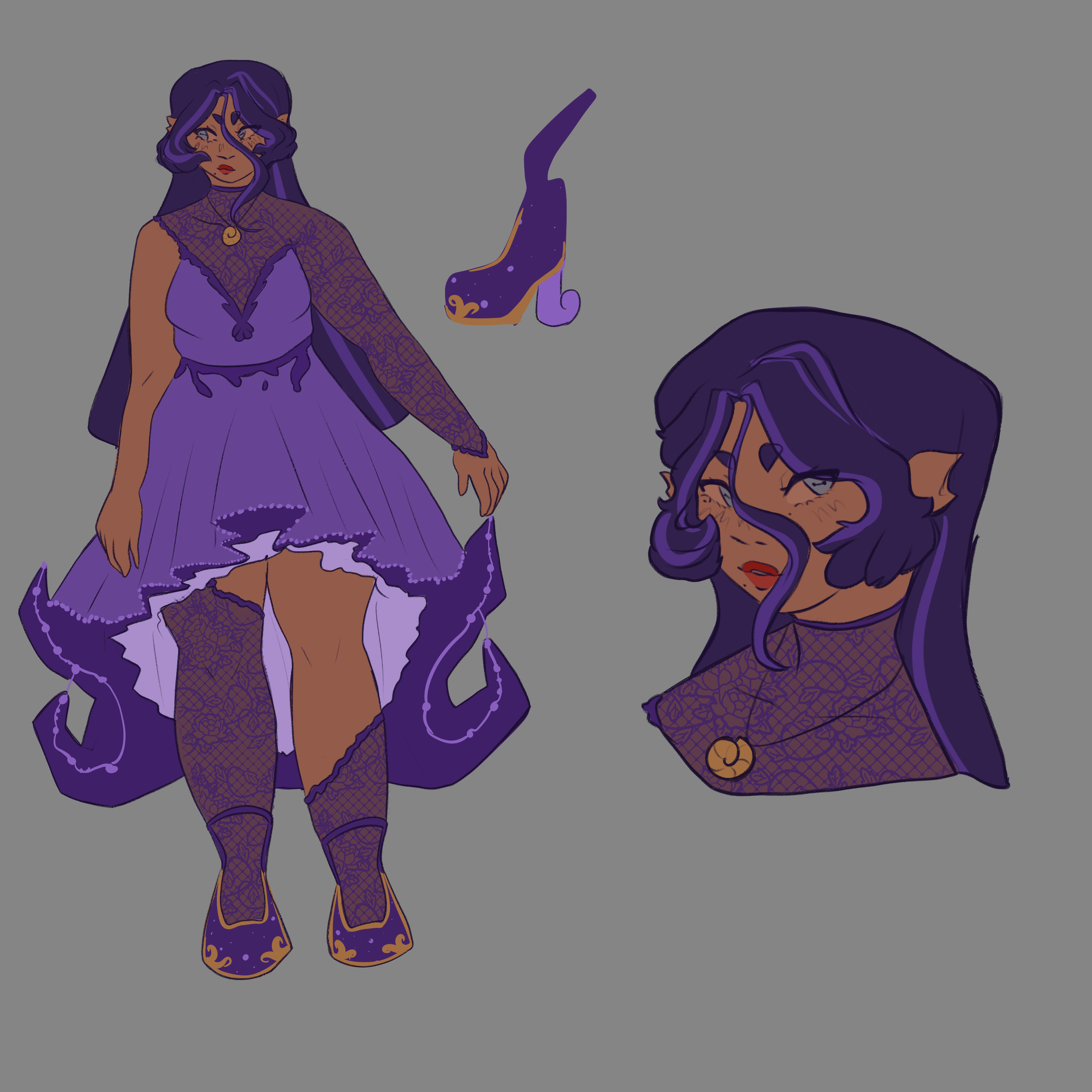 Undine Reference Sheet - Created using Procreate. Undine is an OC that I made based off of Mattel's Ever After High. In the story the main girl's parents are fairytale characters so I wanted to make the daughter of The Little Mermaid's Ursula. I named her Undine because it is a name related to the sea. She has many purples in her design because Ursula's main color is purple and she has spiral shells like how Ursula had to steal Ariel's voice. She would be a rebel in the Ever After High universe. I wanted to make a cool shoe like how Ever After High and Monster High have and I made her hair long and flowy with face-framing pieces and one long strand to mimic hair in water.