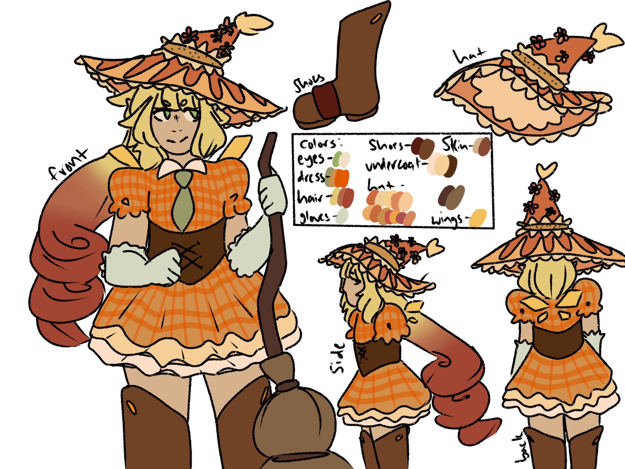 Ebb Reference Sheet - Created using Procreate. I wanted to make a witch OC so Ebb is very self-indulgent, especially at the time I made her before I created Bea. Her hat was based off of one I saw on Pinterest, definitely modified though with color and vibe. Her hair was my favorite part and I wanted to make it very unique and fun to draw. She had been kicked out of her village for being a witch and so she flew away, other than that she doesn't have more background.
